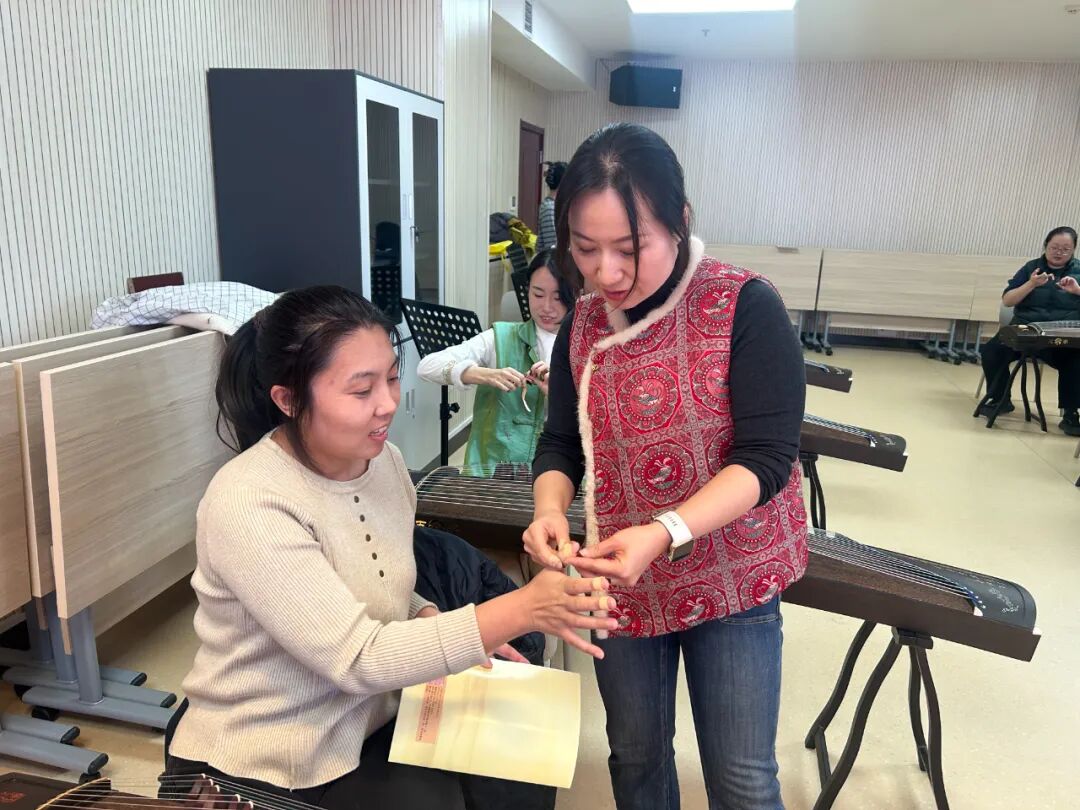 在给学员们做示范弹奏技法的演示和讲解后,李老师到学员旁边,就弹奏手型、基本指法、触弦方式等进行了逐个指导。学员们全神贯注,认真掌握着每个弹奏要领,整个学习过程彰显着古筝艺术的雅致。