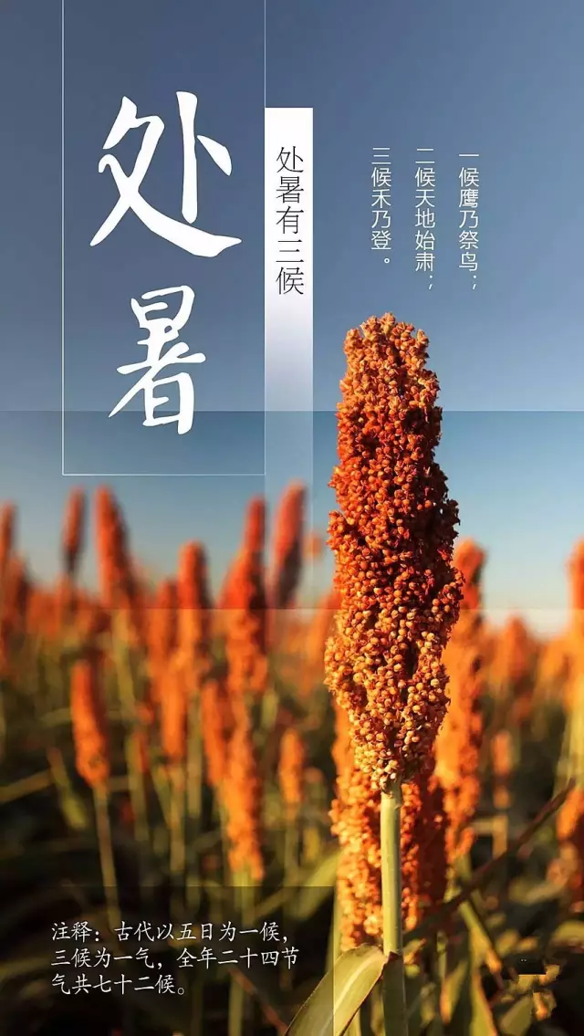 01 >>节气简介<< 处暑,是二十四节气之第十四个节气,也是秋季的第二个节气。 斗指戊(西南方);太阳黄经达150°;于每年公历8月22-24日交节。 时至处暑,已到了高温酷热天气“三暑”之“末暑”,意味着酷热难熬的天气到了尾声。 处暑后,太阳直射点继续南移、太阳辐射减弱,副热带高压也向南撤退,暑意渐消。 雷暴活动也不及炎夏那般活跃,全国各地的暴雨总趋势减弱。