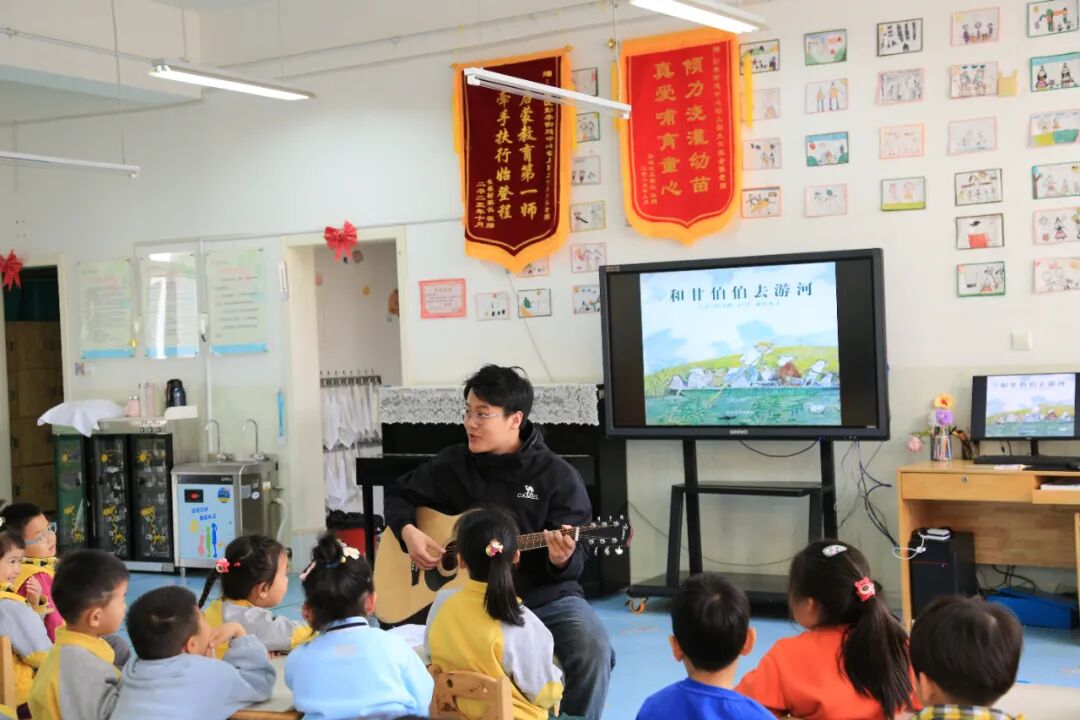 西瓜老师带着小朋友通过多媒体展示,阅读了《和甘伯伯去游河》绘本。故事的最后,芒果老师将绘本的故事改编成了一首儿歌,教唱给小朋友们,在优美的歌声中结束了这堂精彩的故事会。
